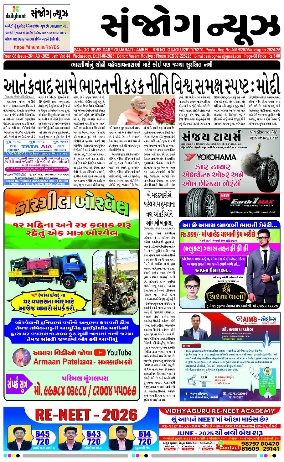 Home ઇપેપેર E-PAPER 25-06-2025 ઇપેપેર E-PAPER 25-06-2025 By Sanjog News - 25/06/2025 RELATED ARTICLESMORE FROM AUTHOR E-Paper 09-03-2026 E- PAPER 08-03-2026 E- PAPER 07-03-2026 E – PAPER 06-03-2026 E-paper 04-03-2026 E-paper 03-03-2026 E-paper 02-03-2026 E- PAPER 01-03-2026 E-paper 28-02-2026 E- PAPER 27-02-2026 E-paper 26-02-2026 E- PAPER 25-02-2026 ચૂંટણી પંચે હુમાયુ કબીરની નવી પાર્ટીને મંજૂરી આપી, બંગાળની ચૂંટણીમાં ભાજપ-ટીએમસીનો... 05/03/2026 ઓહિયોના એક ફાર્મમાં ભીષણ આગ લાગી, જેમાં લગભગ ૬,૦૦૦ પ્રાણીઓ માર્યા... 03/03/2026 મુંદ્રા પોર્ટનો સ્ક્રેપ અપાવવાના બહાને યુવક સાથે રૂ.૫૧,૫૦૦ની છેતરપિંડી 07/03/2026 બ્રિગેડ પરેડ ગ્રાઉન્ડ રેલી સાથે બંગાળ જીતવાની તૈયારી, ભાજપ લઘુમતી રાજકારણ... 06/03/2026 સંકલનની બેઠકમાં ધારાસભ્યએ અધિકારીઓનો ઉધડો લીધો, ઇન્ડસ્ટ્રીયલ એકમો મુદ્દે વિરોધ 07/03/2026 અમરેલી શહેરમાં તા.૬ના રોજ ભરતીમેળો યોજાશે 03/03/2026 ઈરાનમાં અનેક જગ્યાઓ પર એકસાથે હુમલા, મહેરાબાદ ઍરપાર્ટ પર આગ ભભૂકી... 08/03/2026 અમરેલીના શ્રીજી વિધાર્થી ભુવન ખાતે ઇકો ફ્રેન્ડલી હોલિકા દહન 06/03/2026 જુનિયર એનટીઆર હોસ્પિટલમાં પહોંચ્યા, એક ઝલક જાવા માટે ભીડ ઉમટી 09/03/2026 તુલસીશ્યામ રેન્જના રબારીકા રાઉન્ડમાં ગેરકાયદેસર લાકડા ભરેલી ટ્રક ઝડપાઈ 03/03/2026
