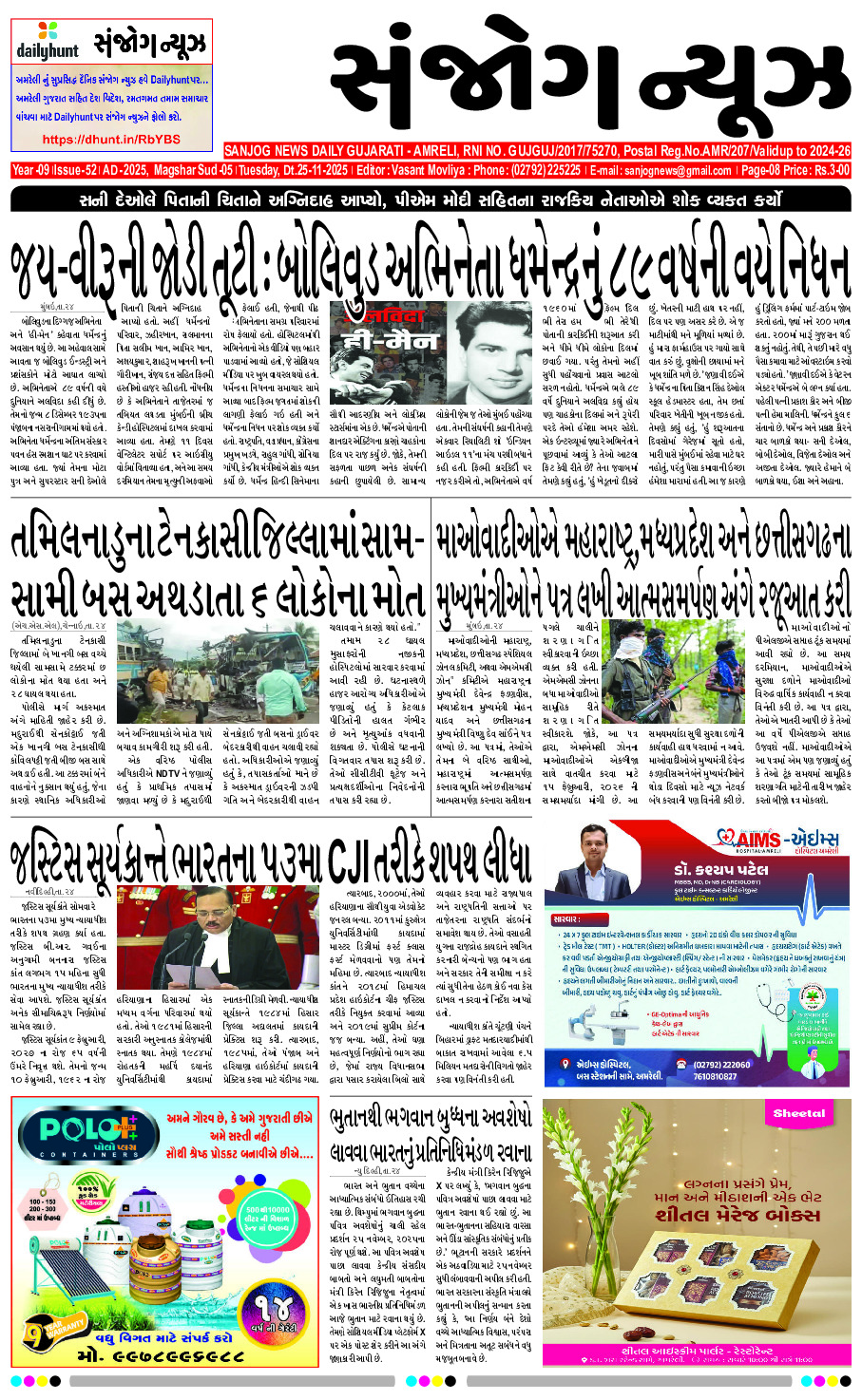 Home ઇપેપેર E- PAPER 25-11-2025 ઇપેપેર E- PAPER 25-11-2025 By Sanjog News - 25/11/2025 RELATED ARTICLESMORE FROM AUTHOR E- PAPER 26-11-2025 E-paper 24-11-2025 E-paper 21-11-2025 E-paper 20-11-2025 E-paper 19-11-2025 E-paper 18-11-2025 E-paper 17-11-2025 E – PAPER 16-11-2025 E-PAPER 15-11-2025 E- PAPER 14-11-2025 E- PAPER 13-11-2025 E- PAPER 12-11-2025 બિહાર ચૂંટણીમાં હાર બાદ પ્રશાંત કિશોર મૌન ઉપવાસ પર, ગાંધી આશ્રમમાં... 21/11/2025 અમરેલીમાં રહેણાંક મકાનમાં તસ્કરો ત્રાટકયા, રૂ.૧.૧૧ લાખની ચોરી 26/11/2025 રાજુલામાં આઈસીઆઈસી બેંક દ્વારા સિનિયર સિટીઝન માટે વિશિષ્ટ કેમ્પ યોજાશે 26/11/2025 લાઠીમાં જમાઈએ સસરાના ઘરે આવી પત્નીને ફરિયાદ પાછી ખેંચવા ધમકી આપી 26/11/2025 ૬૧૫ વર્ષ બાદ ભદ્રકાળી મંદિરમાં જ માતાજીનો થાળ બનશે , મંદિર... 25/11/2025 સાવરકુંડલાની સ્કેલ ઈન્ડસ્ટ્રીઝ દ્વારા વિવિધ મુશ્કેલી અંગે કેન્દ્ર સરકારમાં રજૂઆત 26/11/2025 ફિક્સ પગારવાળા કર્મચારીઓ માટે ખુશખબર, ચાર્જ એલાઉન્સ મળશે! 24/11/2025 અમરેલી જિલ્લા પંચાયત ખાતે આરોગ્ય સમિતિના ચેરમેનની અધ્યક્ષતામાં બેઠક મળી 20/11/2025 અમરેલી ખાતે સરદાર જયંતિ નિમિત્તે યુનિટી માર્ચ યોજાઈ 24/11/2025 પત્નીએ પ્રેમી સાથે મળી પતિનો જીવ લીધો, કોઈને જાણ કર્યા વગર... 24/11/2025