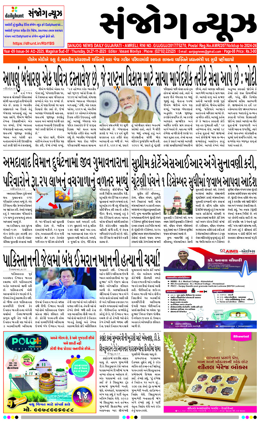 Home ઇપેપેર E-paper 27-11-2025 ઇપેપેર E-paper 27-11-2025 By Sanjog News - 27/11/2025 RELATED ARTICLESMORE FROM AUTHOR E- PAPER 26-11-2025 E- PAPER 25-11-2025 E-paper 24-11-2025 E-paper 21-11-2025 E-paper 20-11-2025 E-paper 19-11-2025 E-paper 18-11-2025 E-paper 17-11-2025 E – PAPER 16-11-2025 E-PAPER 15-11-2025 E- PAPER 14-11-2025 E- PAPER 13-11-2025 ફરી પરેશ ધાનાણીએ મેવાણીના સમર્થનમાં કવિતા લલકારી, “પોલીસને સલામ, પટ્ટાવાળા હરામ” 27/11/2025 મિસ મેક્સીકોને મિસ યુનિવર્સના ખિતાબથી નવાજવામાં આવી છે,ફર્સ્ટ રનર અપ થાઈલેન્ડ 21/11/2025 અમરેલીમાં નવા ૧૨ કિ.મી. બાયપાસ રોડ માટે રૂ.૨૭૦.૬૦ કરોડની વહીવટી મંજૂરી... 25/11/2025 વડીયા પંથકમાં અનાજના કાળાબજારીઓ સામે મામલતદાર મેદાને 26/11/2025 કર્ણાટકમાં ૧૦ મહિનામાં ૧૨૪ પોલીસકર્મીઓને સસ્પેન્ડ કરવાથી મચ્યો હગામો, ભાજપે ગંભીર... 25/11/2025 બગસરાના હામાપુર ગામે બાળકને ફાડી ખાનાર સિંહણ પાજરે પુરાઈ 27/11/2025 સોમનાથ મંદિર સુરક્ષા પોલીસે રાજકોટના વયોવૃદ્ધ માજીને સહાયરૂપ બની પોલીસ તંત્રનું... 27/11/2025 મતદારયાદી સુધારણાના કામકાજના બોજથી ગીર સોમનાથના શિક્ષકની આત્મહત્યા 21/11/2025 આયુષ્માન આરોગ્ય મંદિર દ્વારા વડેરા પ્રા. શાળામાં RKSK કાર્યક્રમ યોજાયો 27/11/2025 સૌરાષ્ટ્ર માં ભાજપ સ્વ. વિજય રૂપાણીના પત્ની અંજલિબેનને સક્રિય કરી શકે... 24/11/2025