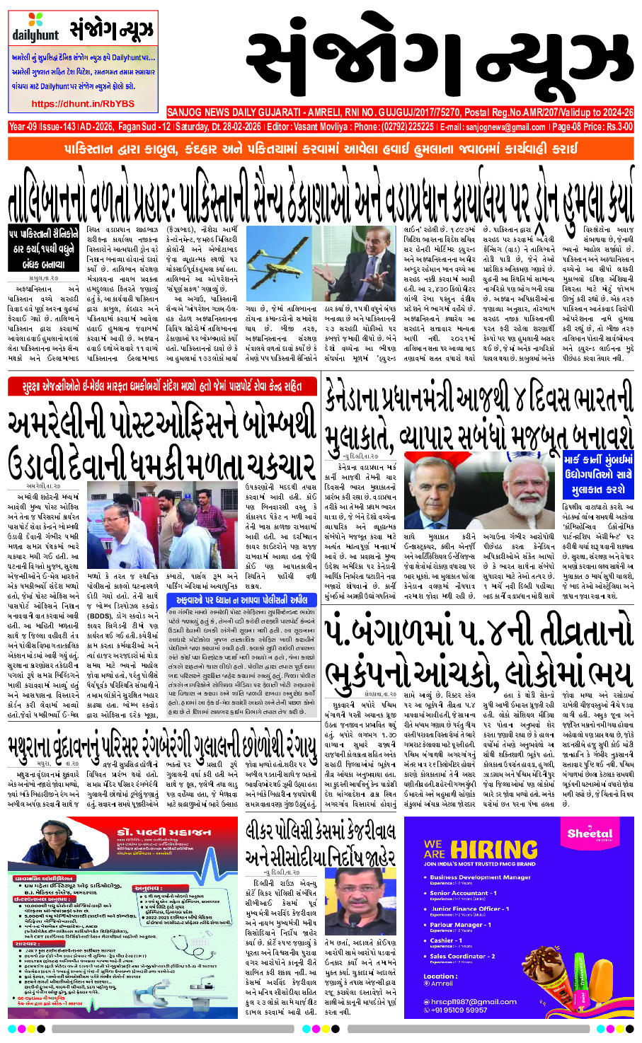 Home ઇપેપેર E-paper 28-02-2026 ઇપેપેર E-paper 28-02-2026 By Sanjog News - 27/02/2026 RELATED ARTICLESMORE FROM AUTHOR E- PAPER 27-02-2026 E-paper 26-02-2026 E- PAPER 25-02-2026 E -PAPER 24-02-2026 E-paper 22-02-2026 E- PAPER 21-02-2026 E – PAPER 20-02-2026 E- PAPER 19-02-2026 E-PAPER 18-02-2026 E-paper 17-02-2026 E- PAPER 16-02-2026 E-paper 15-02-2026 એકનાથ શિંદે અને તેમની પાર્ટી, શિવસેનાએ વીએસઆર વેન્ચર્સના વિમાનોનો ઉપયોગ ન... 26/02/2026 દિલ્હી દારૂ કૌભાંડ અરવિંદ કેજરીવાલ અને મનીષ સિસોદિયા સહિત અન્ય ૨૩... 27/02/2026 સોનિયા ગાંધી નાગરિકતા કેસઃ એફઆઇઆર ની માંગને કારણે સુનાવણી મુલતવી 21/02/2026 મોદી કેબિનેટે સેવા તીર્થ ખાતે તેની પ્રથમ બેઠકમાં કેરળનું નામ બદલીને... 24/02/2026 શ્રીજી વિદ્યાર્થી ભુવન ખાતે વાર્ષિકોત્સવ-૨૦૨૬ અને ધો. ૧૦-૧૨ નો વિદાય સમારંભ... 21/02/2026 અમરેલી જિલ્લામાં બોર્ડ પરીક્ષાનો ઉત્સાહભર્યો પ્રારંભઃ રાજુલા અને લીલીયામાં વિદ્યાર્થીઓનું ભવ્ય... 27/02/2026 ભાવનગરના સિહોર નજીક કારમાંથી ૨૩૦૪ દારૂની બોટલ સાથે ૨ ઝડપાયા, પોલીસ... 21/02/2026 ઈરાનમાં અભ્યાસ કરતા જમ્મુ અને કાશ્મીરના વિદ્યાર્થીઓએ તાત્કાલિક પાછા ફરવું જાઈએ,ફારુક... 24/02/2026 ભારત-પાકિસ્તાન સરહદ પર પોલીસ ચેકપોસ્ટ પર બે સૈનિકોના મોત 22/02/2026 ‘અવેડે કપડાં ધોવા જાવ છું’ કહીને નીકળેલી પરિણીતા લાપતા બની 27/02/2026