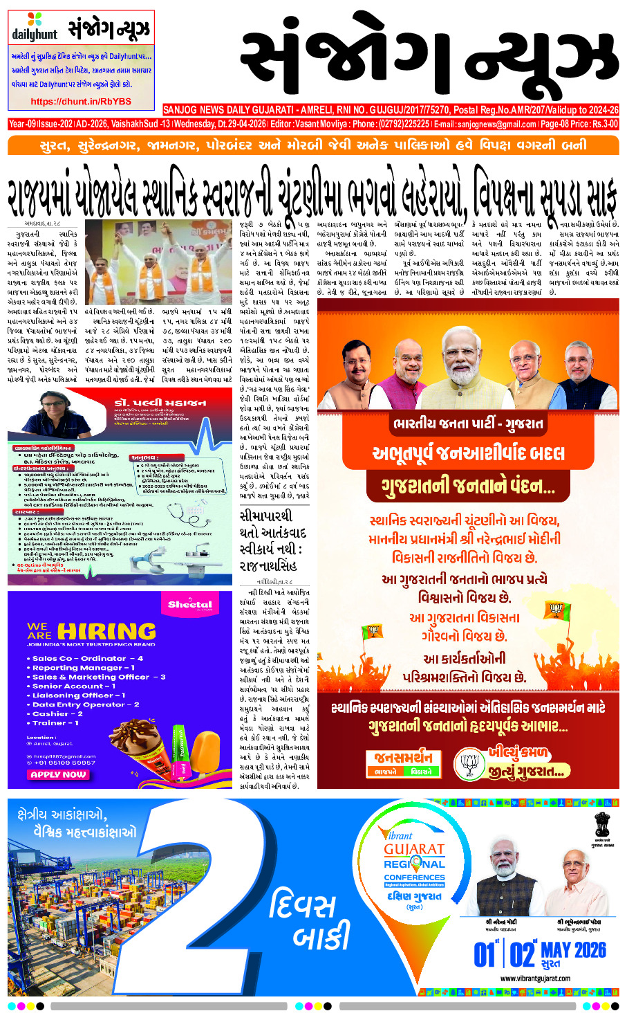 Home ઇપેપેર E-Paper 29-04-2026 ઇપેપેર E-Paper 29-04-2026 By Sanjog News - 29/04/2026 RELATED ARTICLESMORE FROM AUTHOR E-PAPER 28-04-2026 E-Paper 27-04-2026 E-Paper 26-04-2026 E-Paper 25-04-2026 E-PAPER 24-04-2026 E- PAPER 23-04-2026 E- PAPER 22-04-2026 E-Paper 21-04-2026 E- PAPER 20-04-2026 E -PAPER 19-04-2026 E-Paper 18-04-2026 E-Paper 17-04-2017 નકલી ઘી-પનીર તો ઠીક પણ નકલી મતદાન મથક,ખેડામાં પૂઠ્ઠામાંથી મતદાન બોક્સ... 23/04/2026 જાગતા રહેજા, નહીં તો આખું ગામ ગીરવે મુકાઈ જશે, પરેશ ધાનાણીના... 24/04/2026 અમરેલીમાં પત્નીના આડા સંબંધની શંકાએ ઠપકો આપતા પિતા પર બે પુત્રોનો... 26/04/2026 અમરેલીના જેશીંગપરામાં ત્રણ પેઢીએ સાથે મતદાન કર્યું 27/04/2026 રાજુલાના વિકટર ગામ નજીક કબીર આશ્રમ ખાતે ભાગવત સપ્તાહ યોજાશે 23/04/2026 વ્હાઇટ હાઉસ રાષ્ટ્રપતિ ડોનાલ્ડ ટ્રમ્પની સુરક્ષાની સમીક્ષા કરશે, અને ગુપ્ત સેવા... 28/04/2026 બિહારની તિજારી ખાલી છે અને બિહારની મહિલાઓ સાથે દગો કરવામાં આવ્યો... 27/04/2026 બિલેશ્વર ખાંડ ઉદ્યોગને વાવાઝોડાના નુકસાન પેટે રૂ. ૧૦ લાખ વળતર ચૂકવવા... 24/04/2026 બદ્રીનાથ મંદિરના દરવાજા ખુલ્યા, મુખ્યમંત્રી ધામીએ પૂજા કરી; હજારો ભક્તોએ પવિત્ર... 23/04/2026 સેન્સેક્સ ૪૧૭ પોઈન્ટ અને નિફ્ટી ૯૭ પોઈન્ટ ઘટીને બંધ થયો 28/04/2026