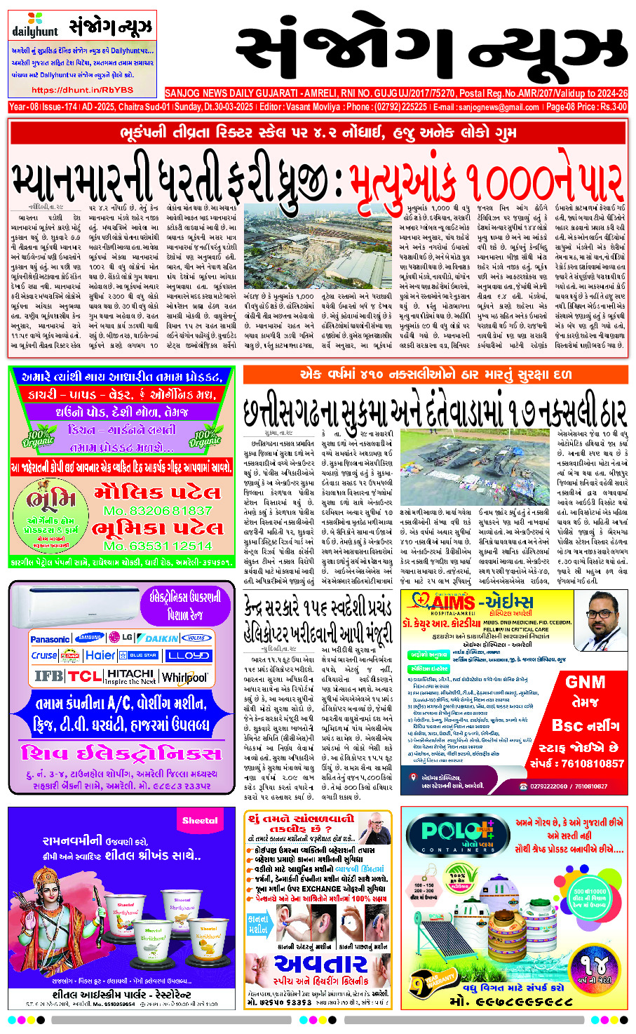 Home ઇપેપેર E-PAPER 30-03-2025 ઇપેપેર E-PAPER 30-03-2025 By Sanjog News - 30/03/2025 RELATED ARTICLESMORE FROM AUTHOR E-paper 28-02-2026 E- PAPER 27-02-2026 E-paper 26-02-2026 E- PAPER 25-02-2026 E -PAPER 24-02-2026 E-paper 22-02-2026 E- PAPER 21-02-2026 E – PAPER 20-02-2026 E- PAPER 19-02-2026 E-PAPER 18-02-2026 E-paper 17-02-2026 E- PAPER 16-02-2026 સાવરકુંડલાની વી.ડી. કાણકિયા અને એમ.આર.સંઘવી કોમર્સ કોલેજ ખાતે વિશ્વ માતૃભાષા દિવસની... 22/02/2026 સા.કુંડલાની નાવલી નદીના પટમાં દબાણ હટાવવા ૧૩૫ પાલા ધારકોને નોટિસ 27/02/2026 યોગી આદિત્યનાથની સિંગાપોર મુલાકાતના પહેલા દિવસે, યુનિવર્સલ સક્સેસ ગ્રુપ સાથે ૬,૬૫૦... 23/02/2026 કેબલ વાયર નાખવા બાબતે થયેલી બોલાચાલી બાદ બાબરાના અમરાપરા ગામે મહિલાનો... 24/02/2026 રશમિકા અને વિજય બે અલગ અલગ રિવાજા દ્વારા એક થઈ રહ્યા... 26/02/2026 શંકરાચાર્ય અવિમુક્તેશ્વરાનંદ અલ્હાબાદ હાઈકોર્ટ પહોંચ્યા અને આગોતરા જામીન અરજી દાખલ કરી 24/02/2026 લાઠીના મેમદામાં માતાજીના દર્શન કરવા જતા કર્મકાંડી યુવક પર હુમલો 22/02/2026 અમરેલીના પ્રગતિશીલ ખેડૂતને રાષ્ટ્રીય કક્ષાનો “બેસ્ટ ઇનોવેટીવ ફાર્મર્સ એવોર્ડ” એનાયત 23/02/2026 ખાંભામાં વીજ કંપની દ્વારા કડક વસૂલાત શરૂઃ ૧.૫ કરોડના બાકી લેણાં... 23/02/2026 વેસ્ટ ઈન્ડીઝે ઝિમ્બાબ્વેને હરાવ્યું, ટીમ ઈન્ડિયા નો રેકોર્ડ તોડીને નેધરલેન્ડ્સના ૧૨... 24/02/2026