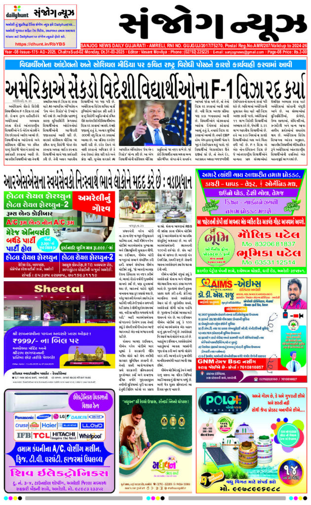 Home ઇપેપેર E-paper 31-03-2025 ઇપેપેર E-paper 31-03-2025 By Sanjog News - 31/03/2025 RELATED ARTICLESMORE FROM AUTHOR E-paper 28-02-2026 E- PAPER 27-02-2026 E-paper 26-02-2026 E- PAPER 25-02-2026 E -PAPER 24-02-2026 E-paper 22-02-2026 E- PAPER 21-02-2026 E – PAPER 20-02-2026 E- PAPER 19-02-2026 E-PAPER 18-02-2026 E-paper 17-02-2026 E- PAPER 16-02-2026 બિહારમાં અયોગ્ય સગીરોને પાકા મકાનો આપવામાં આવ્યા અને લાખો રૂપિયા ચૂકવવામાં... 27/02/2026 લખનૌની કિંગ જ્યોર્જ મેડિકલ યુનિવર્સિટી ખાતેના ધાર્મિક સ્થળો હાલ પૂરતા દૂર... 26/02/2026 અમરેલી ખાતે જિલ્લા સંકલન અને ફરિયાદ નિવારણ સમિતિની બેઠક યોજાઈ 23/02/2026 એર એમ્બ્યુલન્સમાં થયેલ મૃત્યુમાં બે ક્રૂ મેમ્બર, એક દર્દી, બે એટેન્ડન્ટ,... 24/02/2026 ટી ૨૦ વર્લ્ડ કપ ૨૦૨૬ માં એક વિશ્વ રેકોર્ડ સમગ્ર મેચમાં... 24/02/2026 લાઠીના ભીંગરાડ, છભાડીયા-દામનગર રોડ પર રૂ. ૫૦ લાખના ખર્ચે બનનાર આર.સી.સી.... 23/02/2026 કરીનાના દીકરાએ તેના પિતા સૈફ અલી ખાન સાથે એક વૃક્ષ વાવીને... 22/02/2026 ગુજરાત મેરેજ રજીસ્ટ્રેશન એક્ટમાં સુધારાને વિશ્વ હિન્દુ પરિષદનો આવકાર 22/02/2026 ચલાલામાં રૂ.૩ લાખની સોનાની લકી પરત કરી હેર સલૂન માલિકોએ ઈમાનદારી... 24/02/2026 ફી ચૂકવીને બિહારમાં ગમે ત્યાં સરળતાથી દારૂ પહોંચાડી શકાય છે,રાજદના એમએલસી 26/02/2026